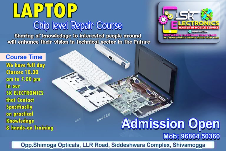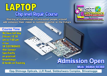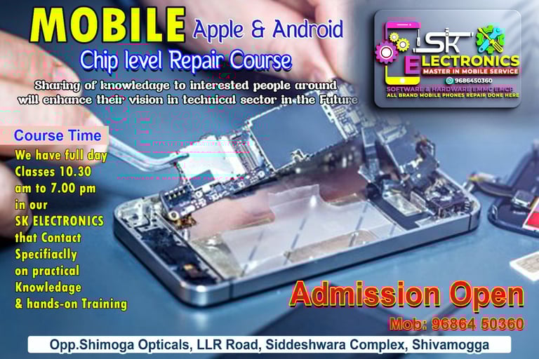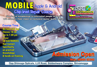 Established in 2019, SK ELECTRONICS is your trusted destination in Shivamogga for comprehensive mobile repair services. Conveniently located on LLR Road, near Durgigudi, we specialize in repairing all brands of mobile phones with precision and care. From screen replacements to software troubleshooting, our expert technicians ensure your device is restored efficiently and reliably. We also offer mobile battery replacement services using high-quality, durable batteries to keep your devices running longer. Beyond repairs, SK ELECTRONICS proudly operates a mobile repairing training center, nurturing skilled professionals for the rapidly growing mobile technology industry. Our commitment to quality, transparency, and customer satisfaction has made us a preferred choice in Shivamogga. Experience reliable service and expert guidance at SK ELECTRONICS.